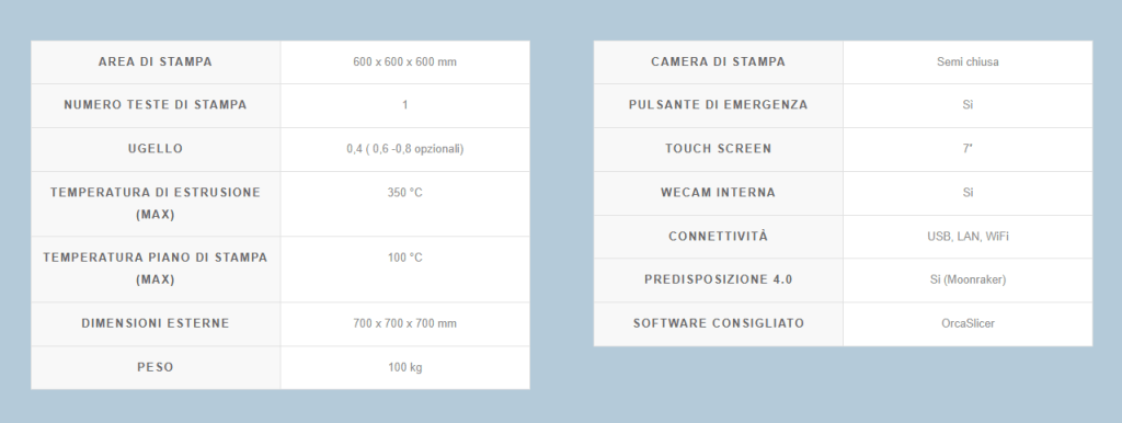 Stampa fino a 60 cm in qualsiasi direzione con ugelli intercambiabili (0,4, 0,6 e 0,8 mm) e temperature fino a 350 °C, compatibile con materiali avanzati come PLA, PETG e PETG-Carbonio.